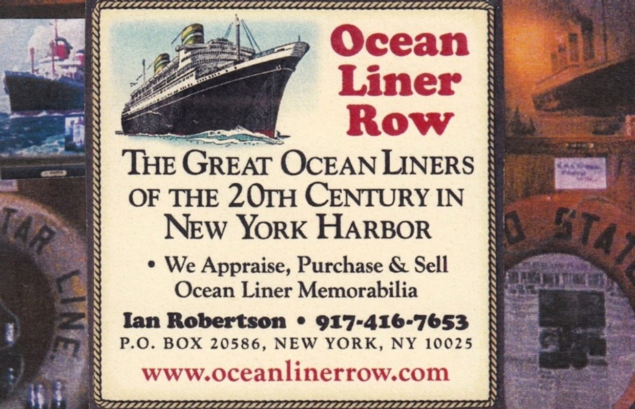 Over the last 30 years, I have devoted time to collecting Ocean Liner Memorabilia, treasures which have come from the international ports of Genoa, La Havre, Cherbourg, Hamburg, Oslo, Stockholm, Rotterdam, London, Liverpool, Southampton as well as from Restaurants, Bars and Shipping Offices that once flourished on 12th Avenue along the Hudson River at the Great Port of New York.